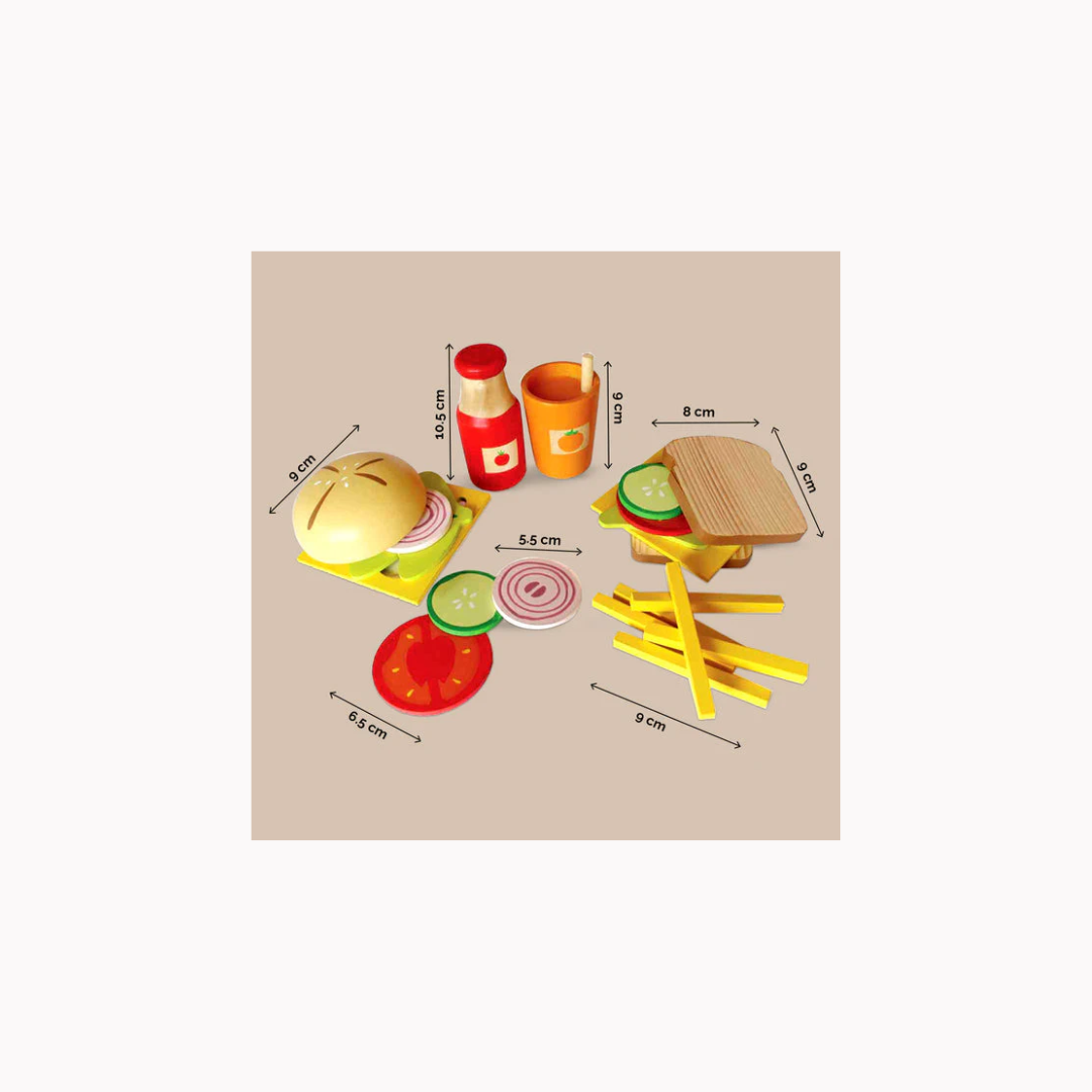 - Spark your child's culinary creativity with the Wooden Sandwich and Burger Pretend Play Set. This set includes various food items like buns, cheese, vegetables, and fries, allowing kids to create their own sandwiches and burgers. Ideal for kids aged 3 and up, it enhances fine motor skills, imaginative play, and social interaction.