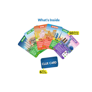 - ULTIMATE GUESSING GAME: Divide yourselves up in teams, or play one on one, ask up to 10 questions to guess the city on the Game Card! Is it in Asia? Is the capital of a country? Is it touristic? Think hard, ask intelligent questions, use your clue cards wisely, and be the first player to win 7 Game Cards!