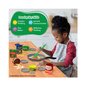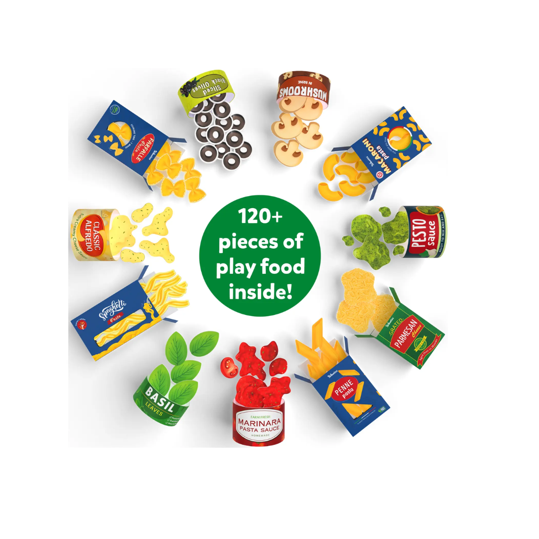 The Skillmatics Let's Make Pasta Set comes with 11 containers of 120+ pieces of sturdy play food inside. Delve into the endless options of pasta, sauces, and toppings, and inspire your little chef to create their own dish! Let your little chef pick a pasta, dress it up with sauce, and sprinkle on their favorite toppings for a different culinary adventure every time.
