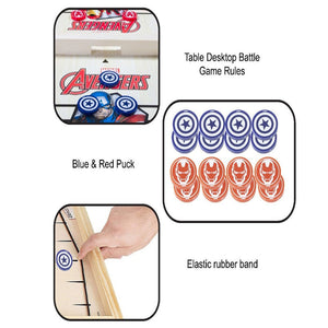 - Start the game and place five pucks on each side of the board. Slide both ends of the elastic band into the side grooves so that they snap into place. Whoever clears the board wins first.