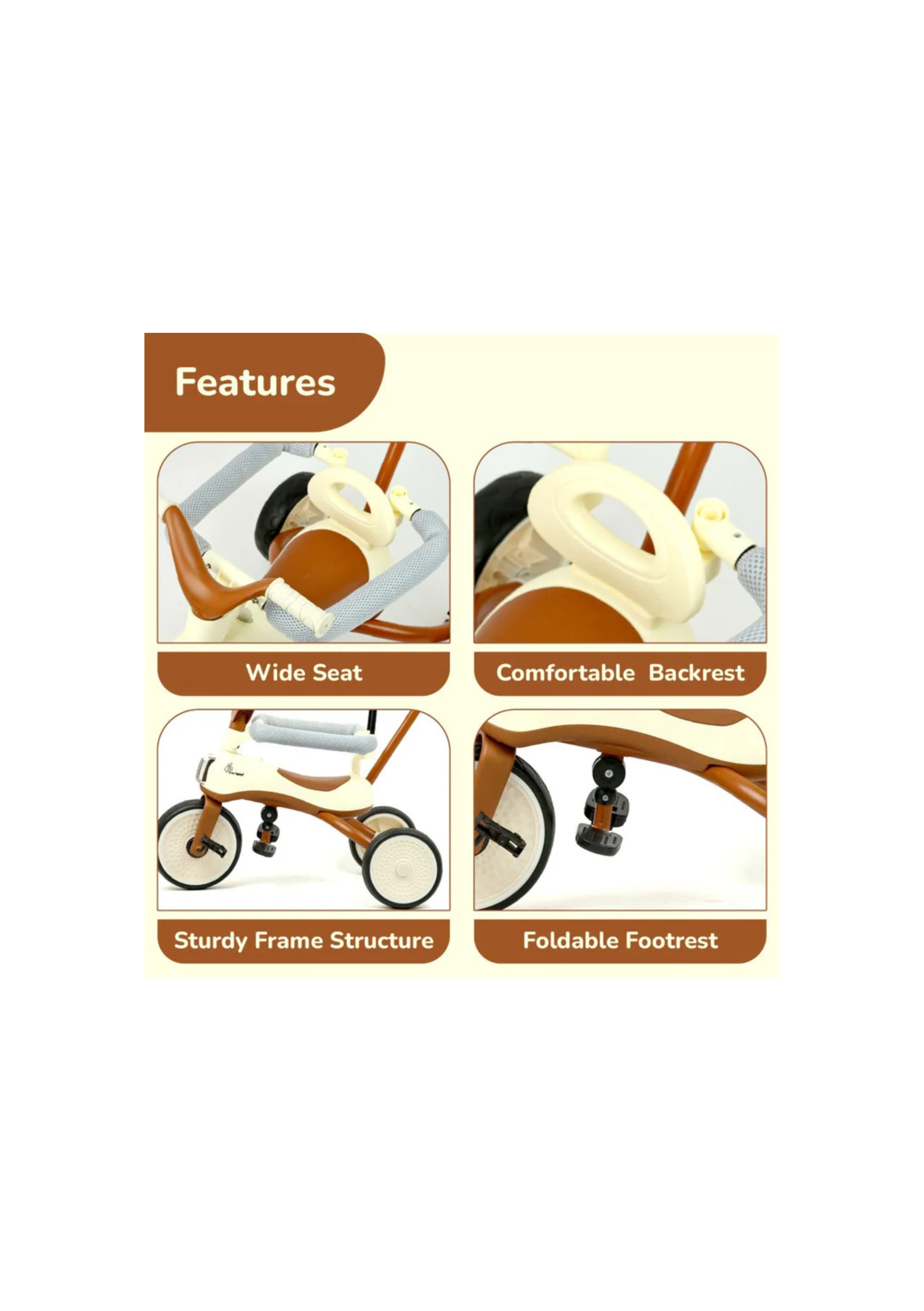Foldable Footrest for Toddlers:ย This feature is designed especially for toddlers where comfort meets convenience. Whether your little one wants to rest their tiny feet during a stroll or pedal on their own, this adaptable design supports their needs at every stage of their development.