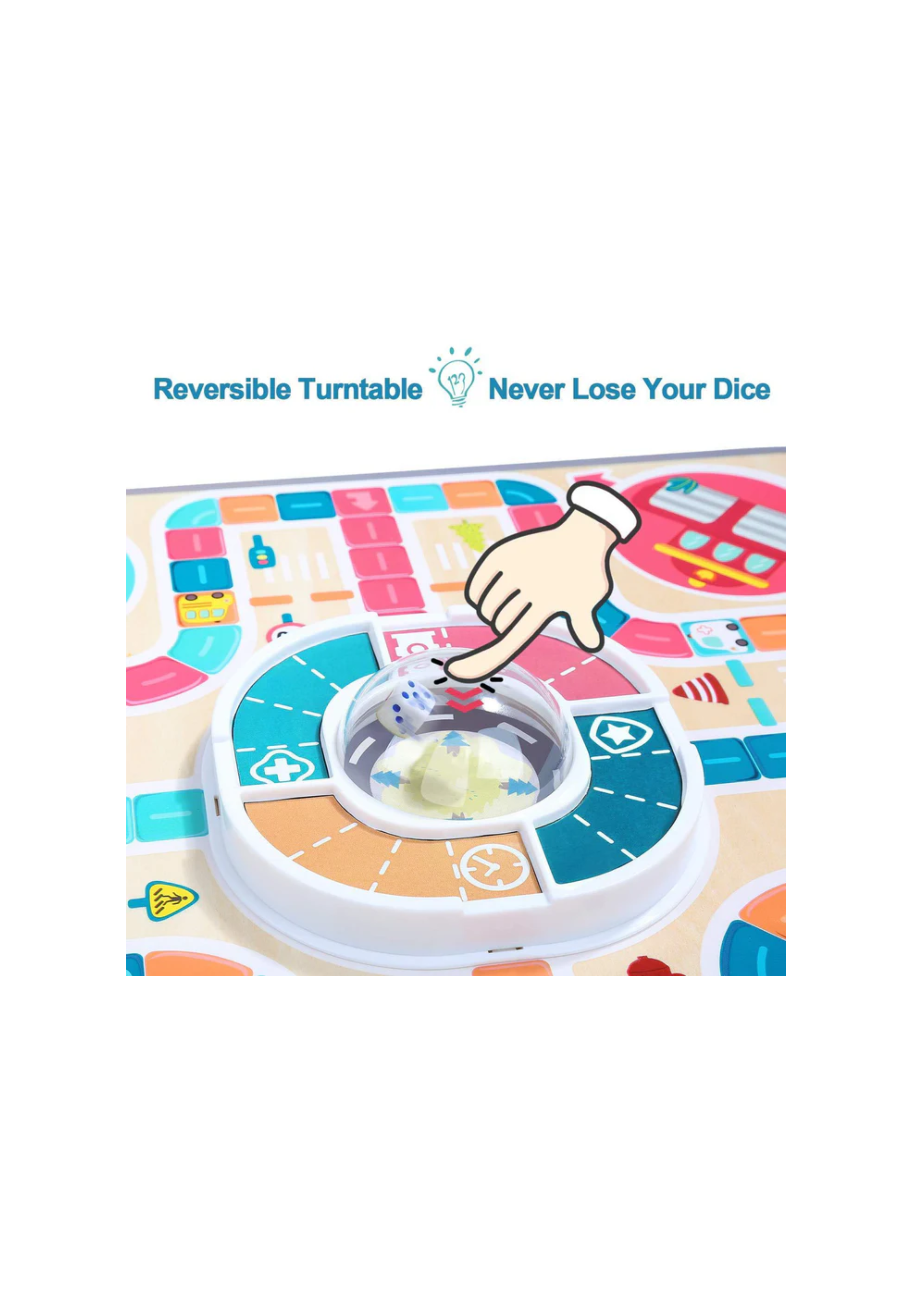 - DOUBLE-SIDED BOARD GAME: 2in1 wooden traffic theme chess toy with flying chess and goose chess. Our urban traffic theme chessboard for 3 year old boys and girls attracts their attention and enhances entertainment interaction. Unique tap the turntable to roll the dice to prevent the dice not easily lost and the detachable dice turntable can be used on both sides. Add four major themes of fire trucks, police cars, school buses and amubulances, which increases the fun of chess games.