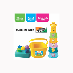 - 2) Stacking Cups : Can also stack cups, learn animals & pair it up with a cute giraffe head. 3) Sorting Shapes : Or use the basket & its lids to sort shapes wonderfully.