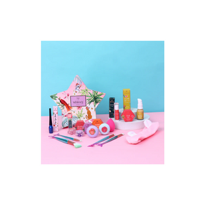 This Blossom Beauty kit is perfect for kids and features top-quality lip and cheek tints,multi-shade eye glitters, eye liner,Lip Gloss, Lip Balm, concealer, brushes, and a beauty blender. The included hair band ensures no stray hairs, and everything is designed to be easy to use for kids.