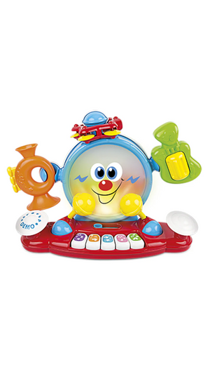 - Includes big bass drum with light effects, 5 keys piano, and boom-clash cymbals