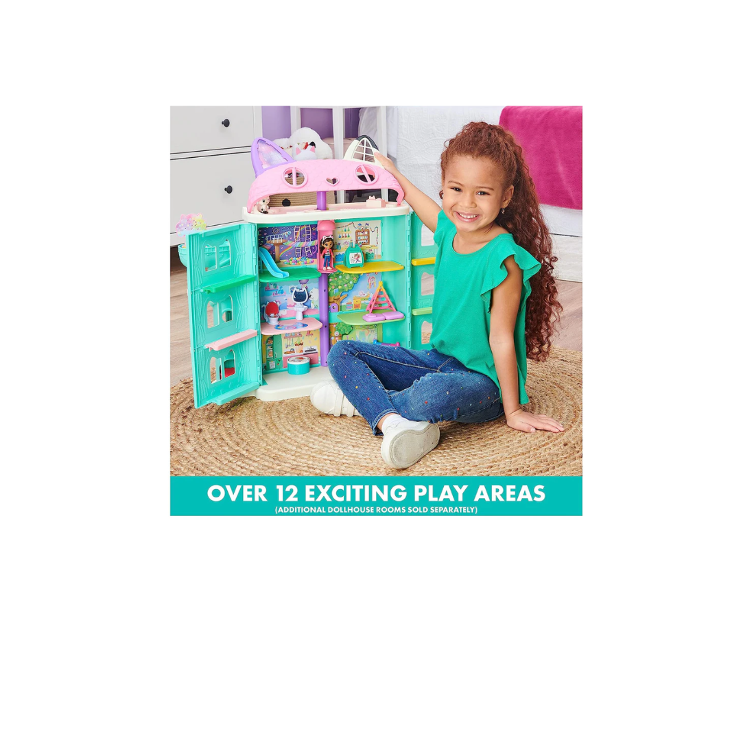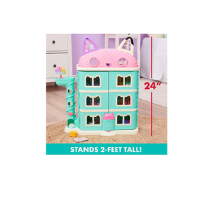 Play inside your own dollhouse world with Gabby’s Purrfect Dollhouse! Standing over 2ft. tall, this fantastical kids dollhouse is packed with exciting features to discover, including a Dollhouse Delivery tower, working Cat-A-Vator, sounds and so much more! With a 3.5-inch Gabby Girl collectible figure, Pandy Paws figure, furniture for each room, three accessories and two Dollhouse Deliveries, you can get straight to the fun right out of the box. Just like in the show, drop a delivery in the tower and press the button to retrieve it – unbox it to find a surprise accessory inside! Open the dollhouse and press the button on the front to hear songs, sounds and phrases from the show! With so many rooms and surprises to explore, use your imagination to play out endless adventures with Gabby and her best pal Pandy Paws. Relax on the music room’s colorful couch and open the door on the tree to reveal a guest on the room’s backdrop. Hungry? Flip the table in the kitchen to turn it from breakfast to dinner! Take a ride in the Cat-A-Vator and slide it up to reach each floor. Help Gabby wash her hands at the bathroom sink or find a colorful surprise in the toilet; let Pandy Paws get some rest under the play tent in the bedroom; get creative on the craft room’s easel and have fun on the playroom’s slide. When you reach the top floor, flip the roof back and play in the attic! Add more rooms to your toy house with the Deluxe Rooms (each sold separately) – slide the rooms directly into the dollhouse’s walls! For easy storage after a fun-filled day of pretend play, Gabby’s Purrfect Dollhouse can close up with or without the Deluxe Rooms inside. This dollhouse is the ultimate gift for kids aged 3 and up. For one last surprise, scan the QR code inside one of the Dollhouse Deliveries to unlock a special reward in the free Gabby’s Dollhouse App (available on iOS and Android). Bring the magic of Gabby’s Dollhouse to life with Gabby’s Purrfect Dollhouse!